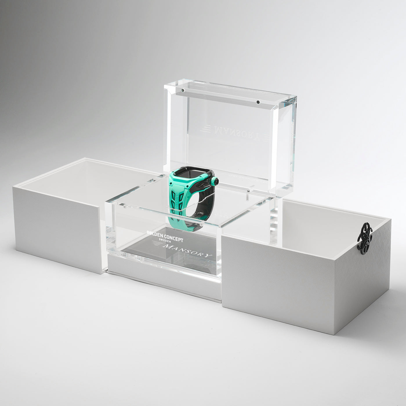 Each Racing Sport Mansory comes in a box as remarkable as the timepiece itself. Meticulously handcrafted, the transparent, crystal-like box highlights our commitment to excellence. This elegant presentation turns the unveiling of your RSM into an unforgettable experience.