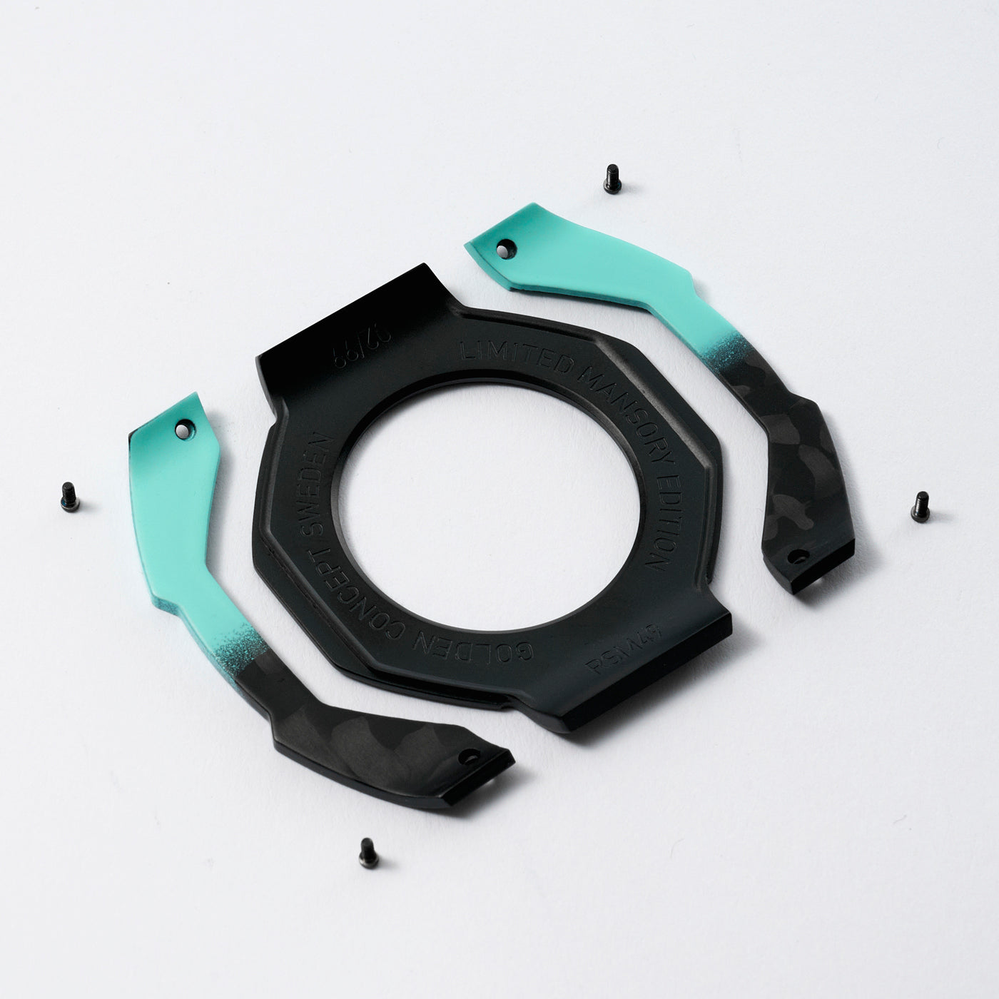 Our latest bezel, crafted from F1-grade TPT carbon composite, features a stunning two-tone design. One half is uniquely colored while the other showcases exposed carbon, with each bezel hand-airbrushed to ensure every piece is one-of-a-kind.