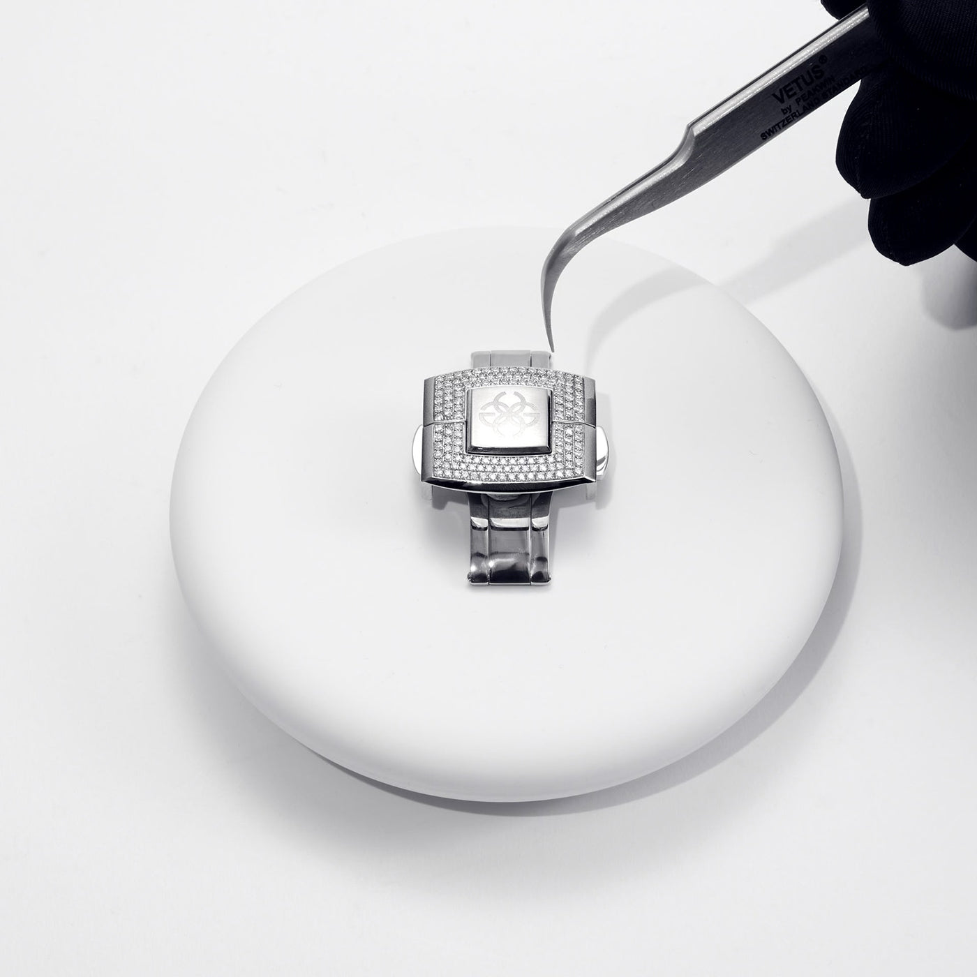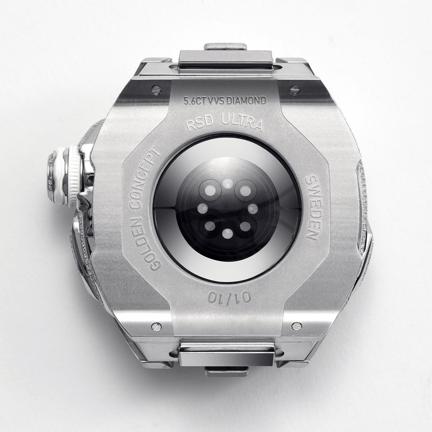 A diamond watch case adorned with 1,068 meticulously selected VVS diamonds, expertly hand-set to create a breathtaking display of brilliance. These exquisite stones, totaling 5.6 carats, transform the case into a radiant masterpiece. The exceptional clarity and sparkle of the diamonds ensure a captivating shine from every angle, making this watch a true statement of opulence and refined elegance.