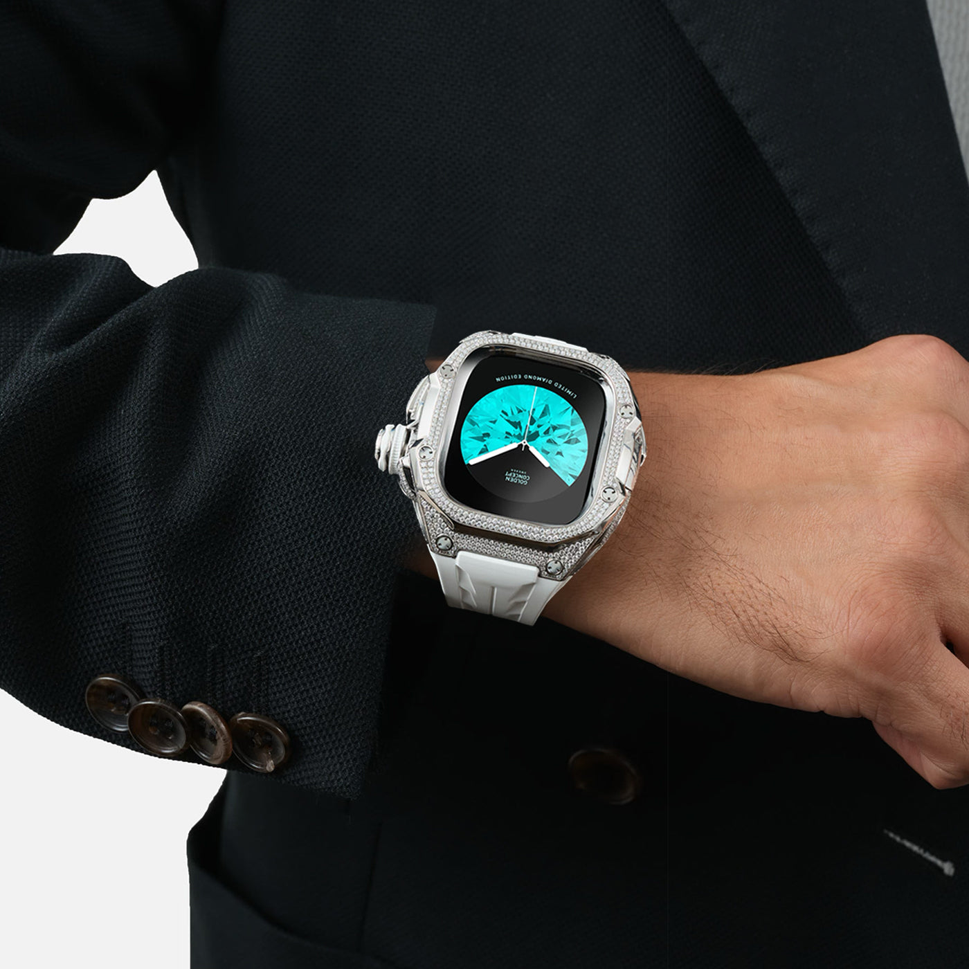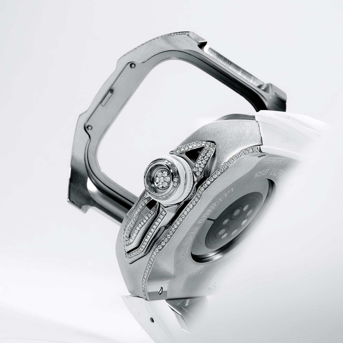 Elevate your style to the highest levels with our diamond-encrusted Apple Watch case. Adorned 1,068 handset diamonds, this luxurious accessory transforms your watch into a statement of opulence and sophistication, ensuring that every glance is met with unparalleled brilliance.
