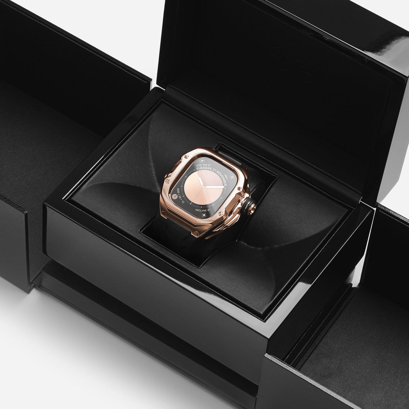 Crafted from a solid block of Surgical steel, renowned for its superior hardness compared to standard steel, this material offers unparalleled protection against scratches and corrosion. Enhanced with an 18k Rose Gold plating and finished with meticulous hand-brushing and polishing, it embodies unmatched durability and sophisticated design.