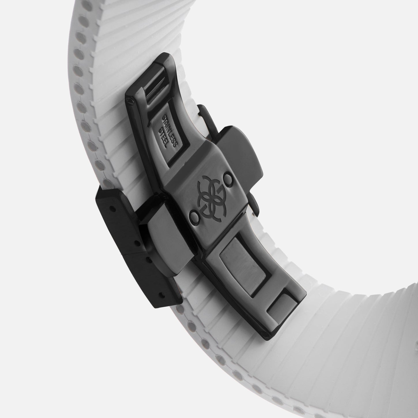 The Onyx Stone features a jet black butterfly buckle, seamlessly complementing its sleek design. Paired with a coral white strap, the contrast creates a striking aesthetic that sets the Onyx Stone apart as a symbol of bold elegance and style.