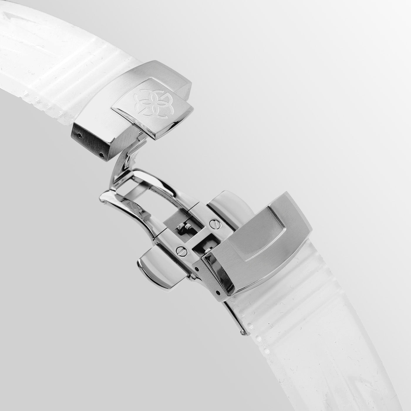 The high-density translucent silicone strap offers both comfort and sophistication. Lightweight and flexible, it moves effortlessly with you, while the stainless steel butterfly clasp adds a touch of elegance. With our click-on mechanism, changing straps is seamless—allowing you to tailor your watch to every moment.