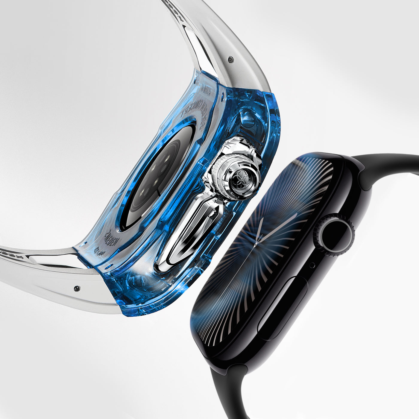Tailored for the Apple Watch Series 10, this case embodies precision and innovation. Its transparent design in a rich blue hue, accented with stainless steel elements, seamlessly enhances your Apple Watch—elevating both form and function while making it a modern statement piece.