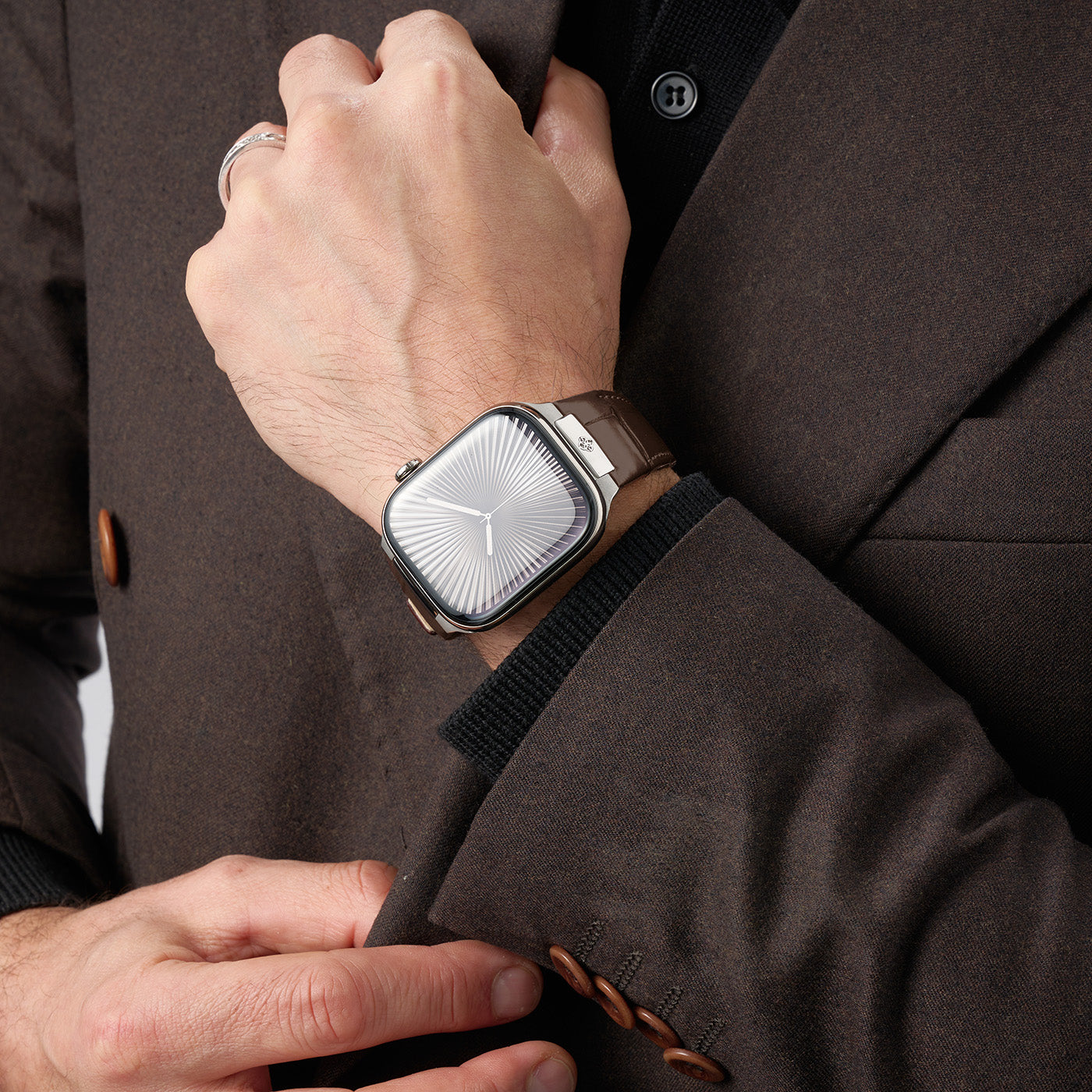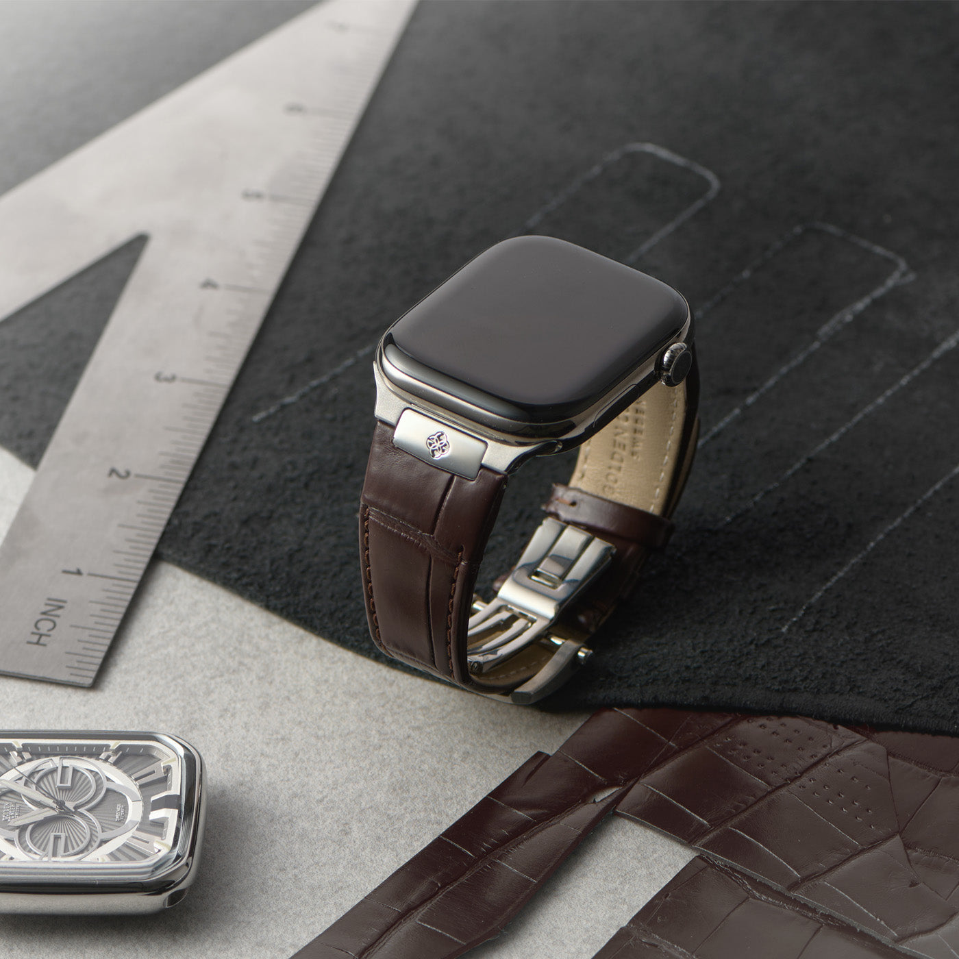 Each Apple Watch strap is presented in packaging that reflects its quality and craftsmanship. Thoughtfully designed, the box features a refined black leather interior that enhances the sense of luxury. This is more than just packaging; it’s a testament to our commitment to excellence, turning the unboxing of your strap into an experience.