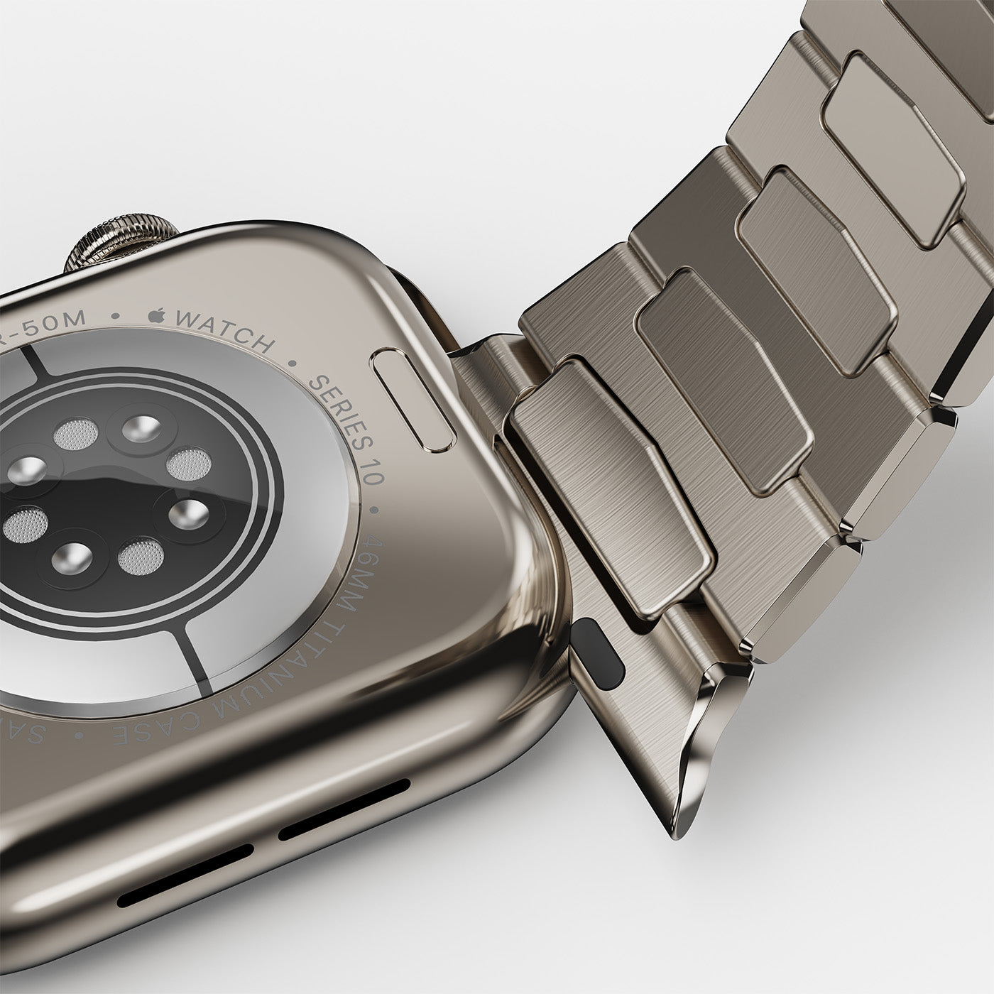 Introducing the next generation of our Royal Apple Watch strap, featuring a revolutionary resizing system. Instead of removing pins and links, this updated model allows you to effortlessly click the links on and off, offering a quick, customizable fit.
