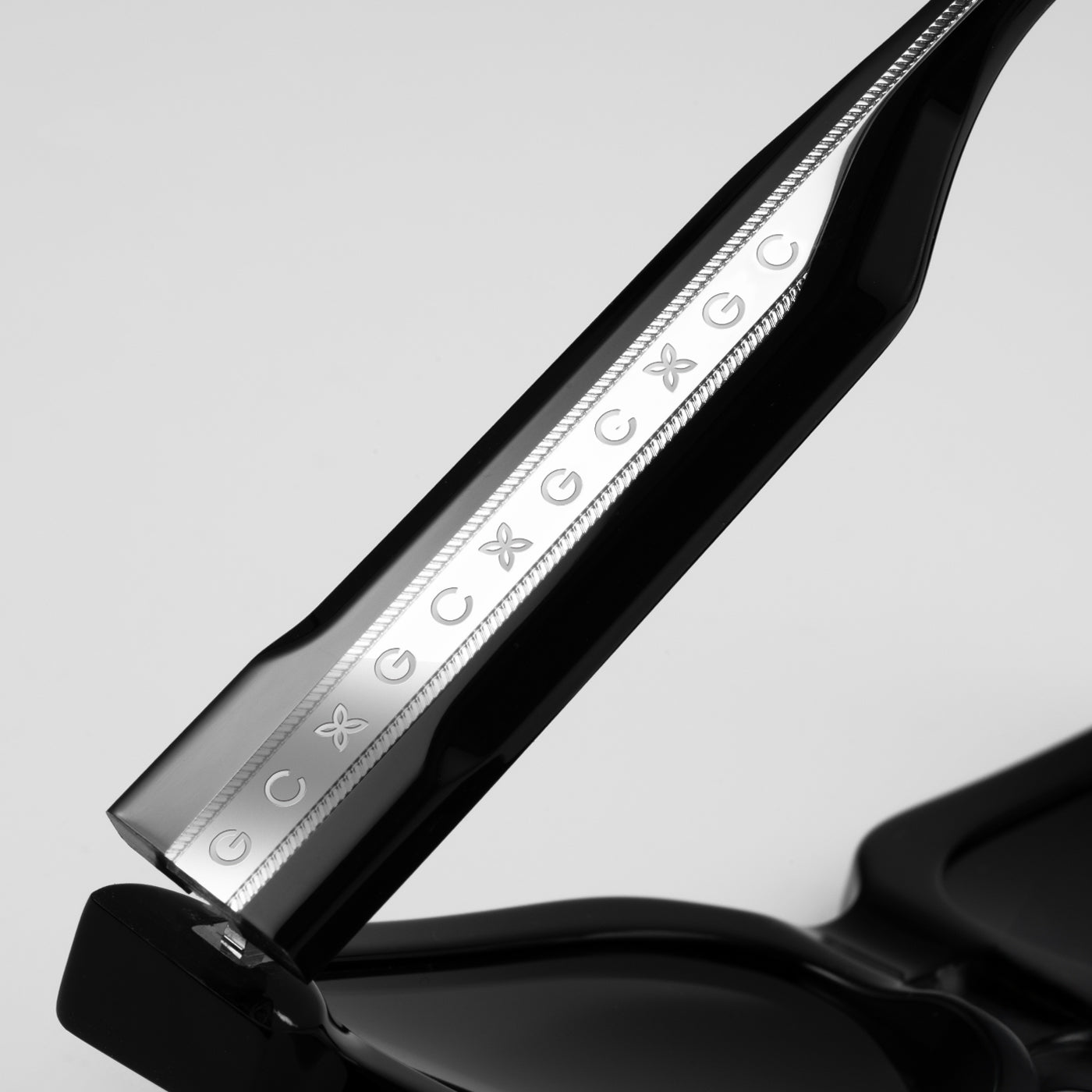Showcasing exceptional craftsmanship, the intricate Guilloché pattern on the temples adds depth and texture to the frame. This engraving, a hallmark of luxury watchmaking, flows seamlessly from the temples to the hinges, with the GC monogram elegantly incorporated, reflecting precision and attention to detail.
